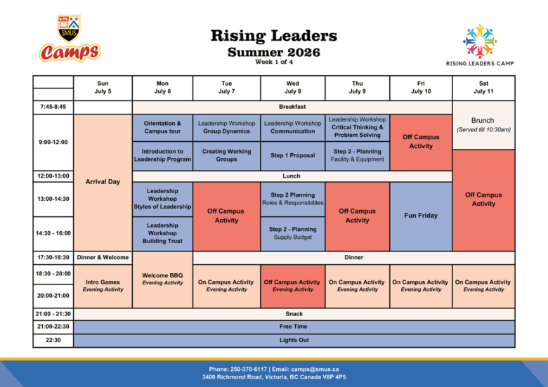 SMUS(セントマイケルズ・ユニバーシティ・スクール)Rising Leaders Camp(ライジング・リーダーズ・キャンプ)スケジュール表2026
